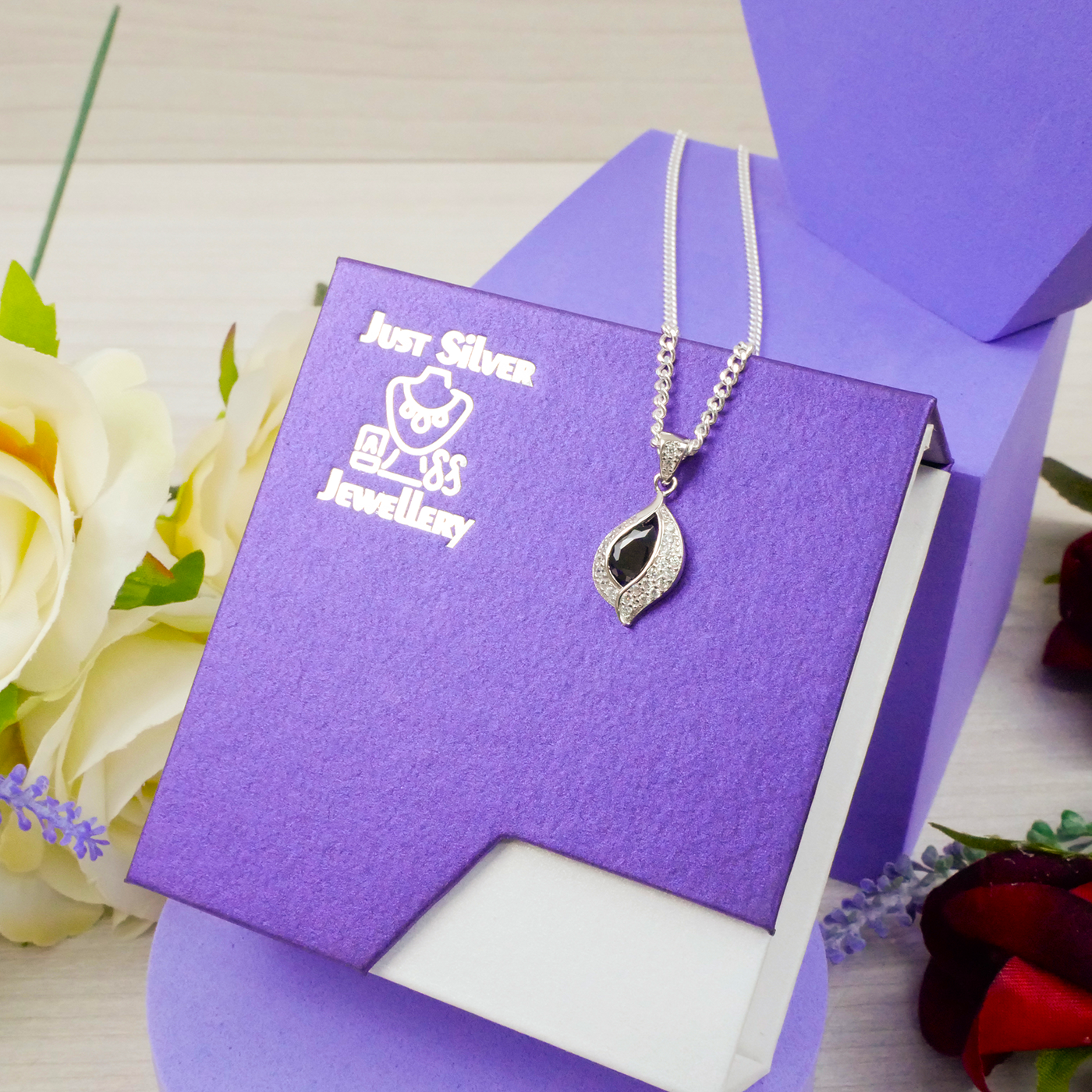 This silver "Teardrop" black zirconia pendant features sparkling zirconia gems surrounding the centre stone. Paired with our fine silver curb chain, it complements this pendant perfectly.